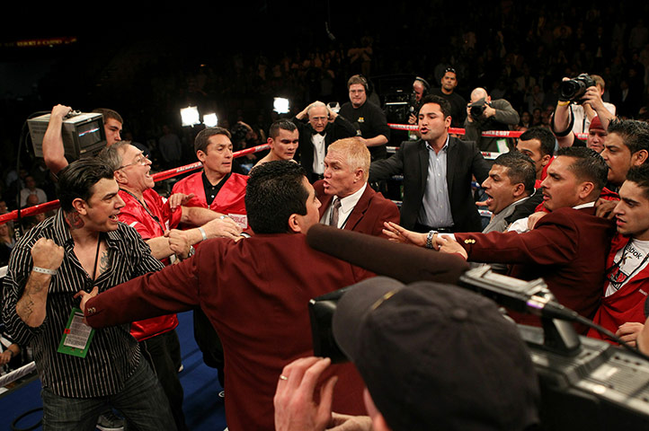 That guy in the striped shirt with the fist up might be Maidana's manager. And from Amir's team are his Manager Asif Wali, his brother Haroon Khan, his uncle Tahir Khan and his friend Saj Mahmood. Looks like a verbal fight between both teams.