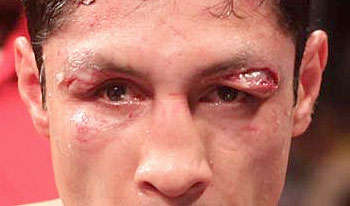 Where his trainer lifts him up with his face pouring with blood.