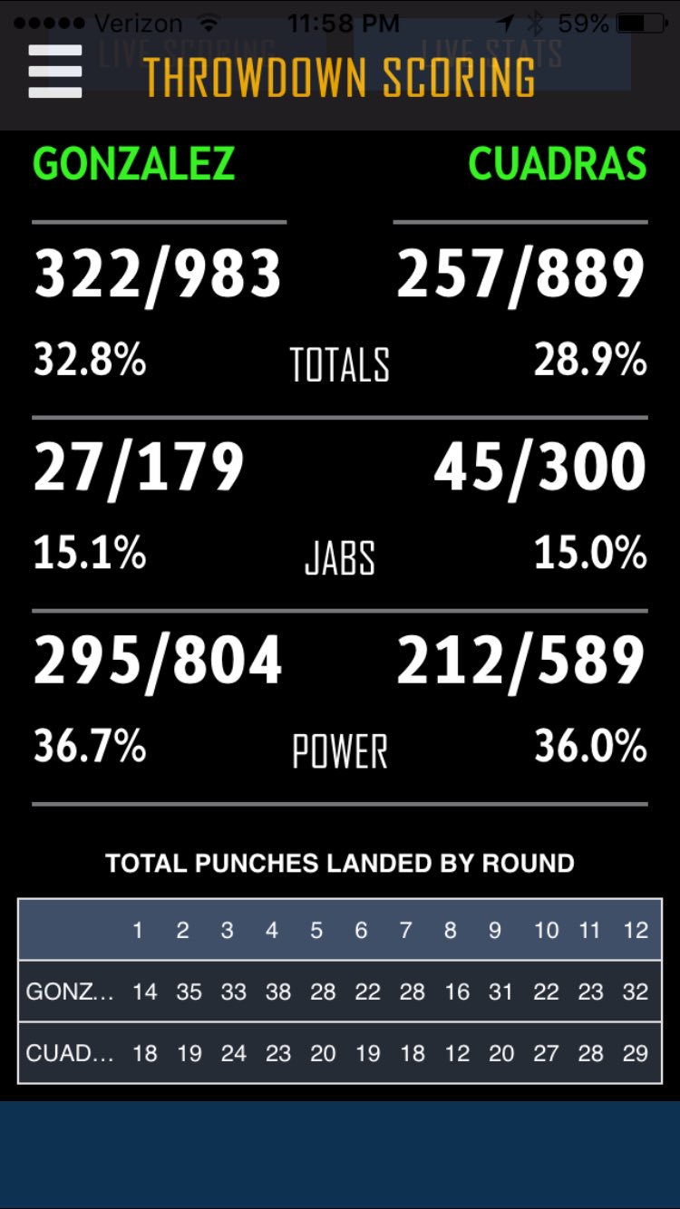 Cuadras got his shots in there last night, for sure. He wasnt bothered at all by Gonzalezs punches except that there were so many of them at time, and he landed some beautiful punches on Gonzalez. Saying all of that, Gonzalez landed way more punches in all but a few rounds according to both compubox and my eyes, and was never is big trouble. And, as another poster said, most of those flashy 4 punch combos Cuadras was throwing either completely missed or were blocked. Gonzalez's defense is great and his size made him an awkward target.