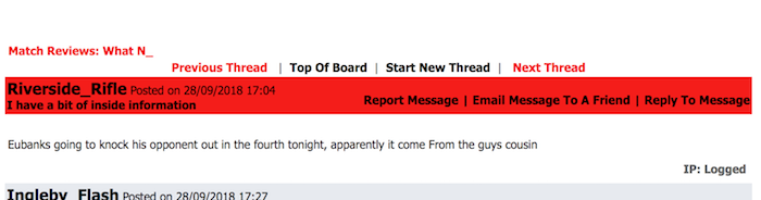 A friend of mine linked me to a football (soccer) forum that he uses and sent me a screen shot of someone that put up a post 3 hours before Eubank's fight tonight that his opponent will be stopped in the 4th round and to put a bet on it. The tip come from JJ McDonagh's cousin. His opponent didn't come out for the 4th, which pays out as a 4th round knockout.